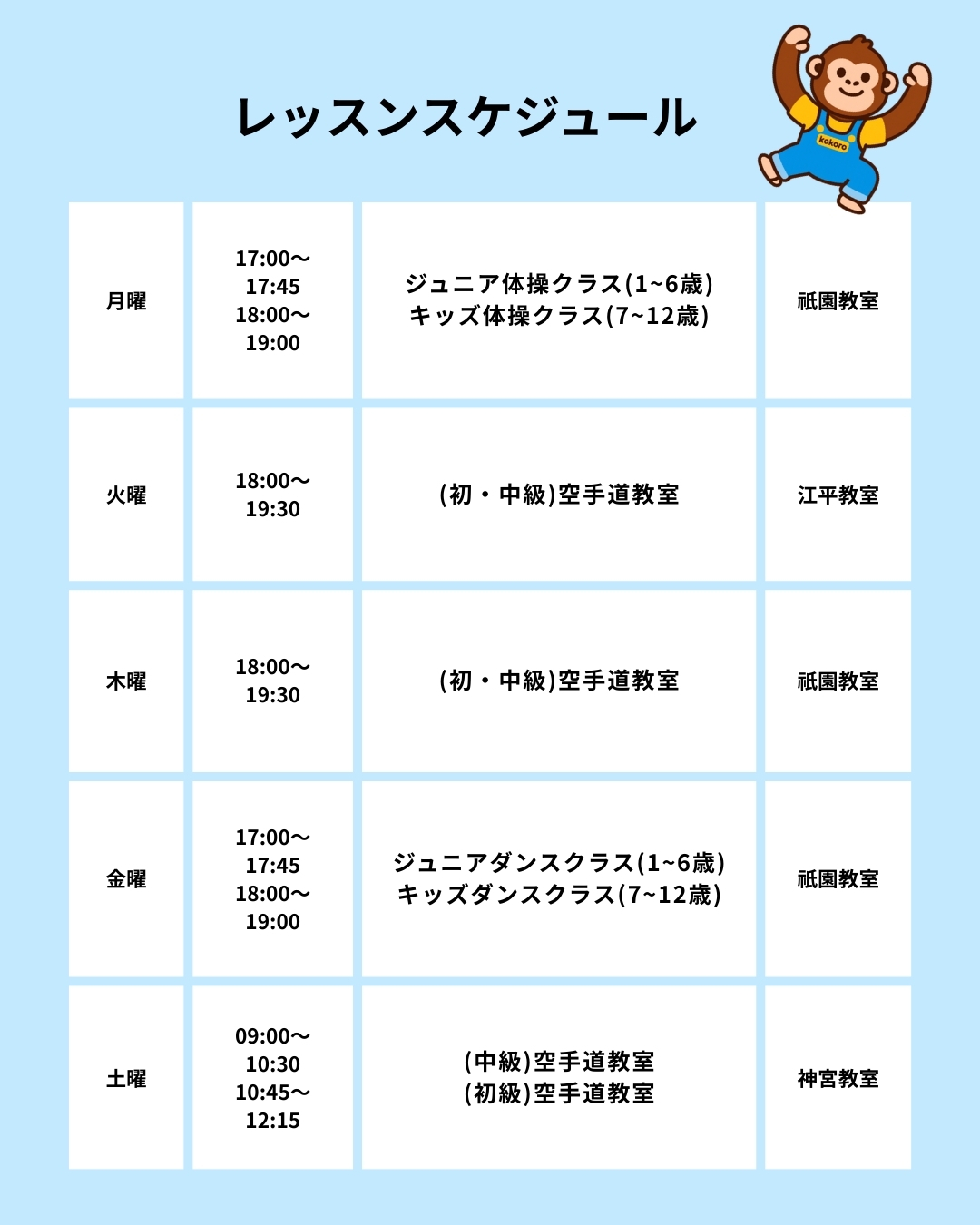 宮崎市の子どもの発育・発達を促すことに特化した体操教室🤸 🔻祇園教室(月曜)🔻 キッズクラス(1〜6歳) 17:00〜17:45 ジュニアクラス(7〜12歳) 18:00〜19:00